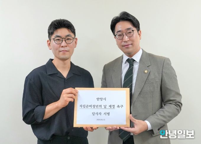 안녕일보 배윤 기자 | 안양시의회 김도현 의원(민주당, 평촌․평안․귀인․범계․갈산)은 지난 12일 오전, 브라더스키퍼 김성민 대표를 만나 자립준비청년 157명의 연서명이 담긴 ‘자립준비청년의 날 지정 촉구 건의서’를 전달받았다고 밝혔다.