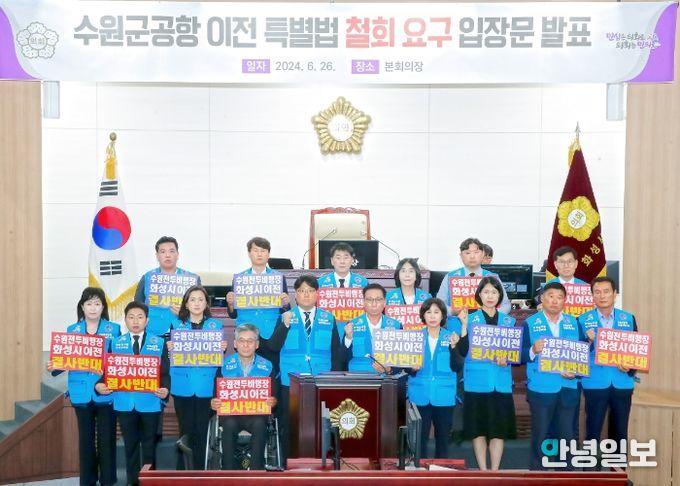 안녕일보 배윤 기자 | 경기 화성시의회가 26일 「수원 군공항 이전 및 경기남부통합국제공항 건설을 위한 특별법」 발의한 행위에 대해 철회를 요구하는 입장문을 발표했다. 시의회는 입장문 발표에서 수원 군공항으로 피해를 받고 있는 병점권 주민과 국방부에서 군공항 이전 예비 후보지로 선정된 서부권역 주민간의 갈등을 부추기는 이러한 행위를 규탄하며, 특별법 철회를 요구했다.