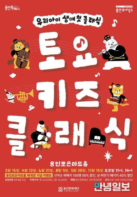 오는 18일 용인포은아트홀은 1,525석으로 객석 수를 확장하고 공간을 증축하는 공사를 마치고 재개관을 앞두고 있다. 이에 재단에서는 재개관을 기념하여 ‘토요키즈클래식’을 할인가로 만나볼 수 있는 파격적인 이벤트를 진행하고 있다. 선착순 예매자 150명 대상 50% 할인 판매는 전석 매진됐으나, 상반기 3개 회차(▲2월 15일 ▲4월 12일 ▲6월 21일) 공연을 40% 할인가로 구매할 수 있는 패키지는 예매가 가능하다.