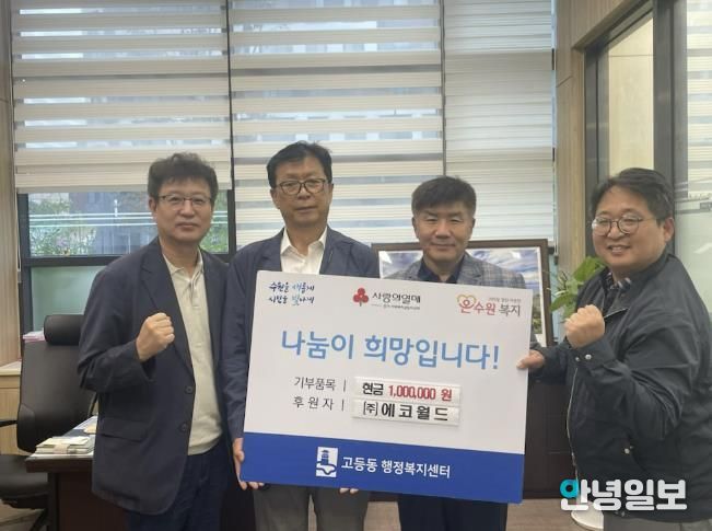 안녕일보 배윤 기자 | 수원시 팔달구 고등동은 10월 13일, 사회적기업 ㈜에코월드로부터 관내 취약계층을 위한 이웃돕기 성금 100만원을 전달받았다고 밝혔다.