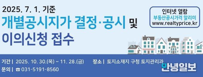 안녕일보 배윤 기자 | 수원시 영통구는 2025년 7월 1일 기준 개별공시지가를 10월 30일 결정·공시하고, 11월 28일까지 이의신청 기간을 운영한다. 이번에 결정·공시되는 대상은 올해 1월 1일부터 6월 30일까지의 토지 분할, 합병, 지목변경 등 변동 사항이 있는 58필지이다.