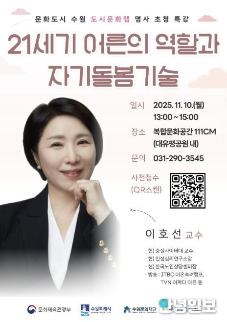 안녕일보 배윤 기자 | 수원문화재단이 오는 11월 10일 월요일 오후 1시, 복합문화공간 111CM에서 심리학 전문가 이호선 교수를 초청해 시민 대상 인문심리 특강 “21세기 어른의 역할과 자기돌봄 기술”을 개최한다.