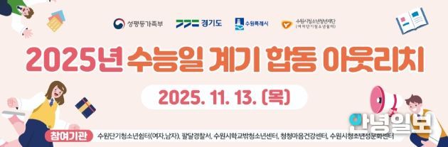 안녕일보 배윤 기자 | (재)수원시청소년청년재단 수원여자단기청소년쉼터는 11월 13일 오후4시부터 8시까지 수원역 일대(수원역 로데오 문화광장, 수원역 7번,12번 출구)에서 청소년들이 안전하고 건강하게 성장할 수 있는 지역사회를 만들기 위해 수원여자단기청소년쉼터 주관, 수원시 시민협력교육국, 경기남부경찰청, 팔달경찰서, 수원시청소년성문화센터, 수원시상담복지센터, 수원시학교밖청소년지원센터, 수원시청청마음건강센터, 수원남자단기청소년쉼터 총 9개의 기관이 참여하는‘수능 맞이 합동 아웃리치’로 진행한다.