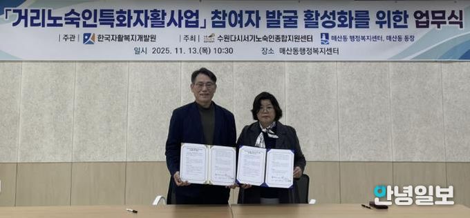 안녕일보 배윤 기자 | 수원시 팔달구 매산동과 수원다시서기 노숙인종합지원센터는 지난 13일, 거리노숙인들의 안정적인 사회 복귀를 지원하기 위해 ‘거리노숙인 특화 자활사업 참여자 발굴 활성화를 위한 업무협약(MOU)’을 체결했다.