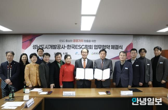 안녕일보 배윤 기자 | 성남도시개발공사는 지난 8일 한국ESG학회와 ESG경영 실천 문화 확산과 지속가능한 공공가치 창출을 위해 업무협약(MOU)을 체결했다고 9일 밝혔다.