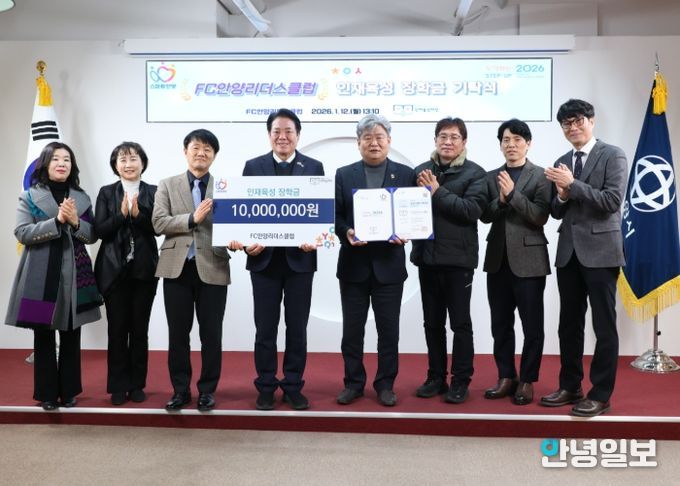 안녕일보 배윤 기자 | 안양시 인재육성재단은 지난 12일 안양시 기반의 시민 참여형 후원 조직인 ‘FC안양리더스클럽(회장 김인환)’으로부터 미래 인재 양성 장학금 1,000만 원을 전달받았다고 13일 밝혔다.