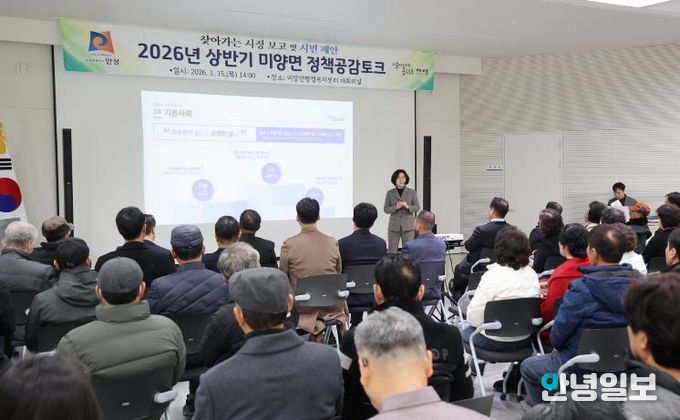 안녕일보 배윤 기자 | 안성시 미양면은 지난 1월 15일, 미양면행정복지센터 대회의실에서 주민 120여 명이 참석한 가운데 ‘2026년 상반기 미양면 정책공감토크’를 성황리에 개최했다.