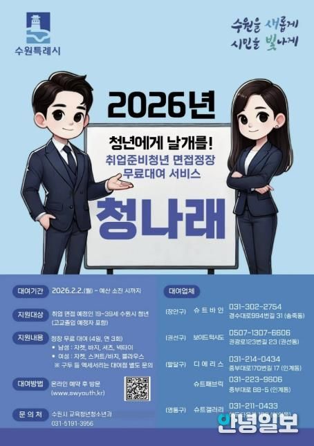 안녕일보 배윤 기자 | 수원특례시가 취업 준비 청년에게 면접 정장을 무료로 대여하는 ‘청나래’ 사업을 2월 2일 시작한다.