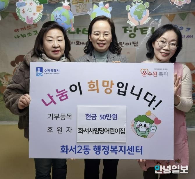 화서사임당어린이집은 지난 2일, 원아들과 학부모, 교직원이 함께 진행한 바자회 수익금 50만 원을 어려운 이웃을 위해 사용해 달라며 화서2동 행정복지센터에 기부했다.