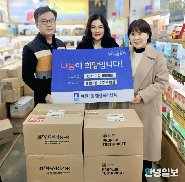 안녕일보 배윤 기자 | 영통구 매탄1동 행정복지센터는 지난 3일 호주면세점직영할인점 매탄점이 설 명절을 맞이해 매탄1동 행정복지센터에 프로폴리스 치약 100개, 오일 관절크림 100개를 후원했다고 밝혔다.