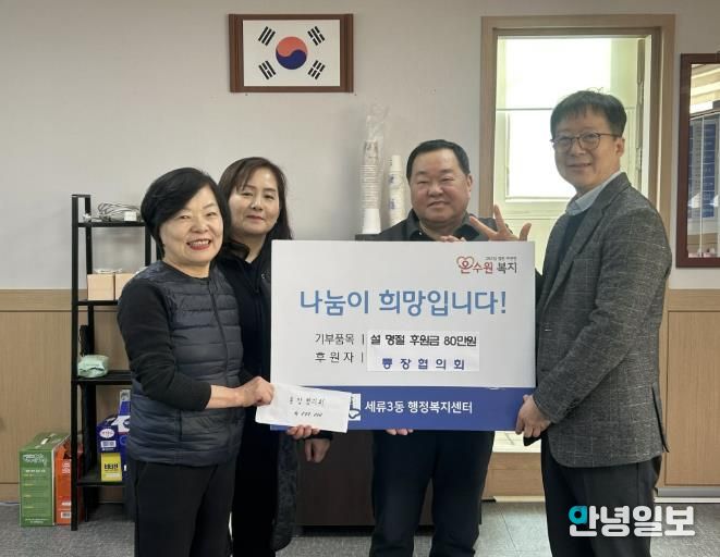 안녕일보 배윤 기자 | 세류3동 행정복지센터는 지난 2월 2일, 세류3동 통장협의회가 지역 내 어려운 이웃을 위해 이웃 돕기 성금 80만 원을 기부하고, 통장협의회 회장이 개인 성금 20만 원을 추가로 기탁해 총 100만 원의 성금이 전달됐다고 밝혔다.