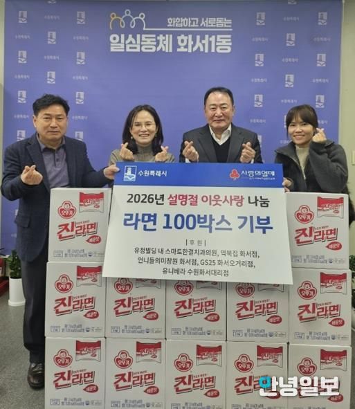이번 기부는 유정빌딩 입주상가인 ▲스마트한결치과의원 ▲역북집 화서점 ▲언니들의 미장원 화서점 ▲GS25 화서오거리점 ▲유니베라 수원화서대리점이 지역 내 어려운 이웃을 돕기를 위해 뜻을 모아 마련했으며, 기부된 라면 100박스는 화서1동 행정복지센터를 통해 관내 저소득층 및 취약계층 가구에 전달될 예정으로, 설 명절을 앞두고 따뜻한 나눔의 의미를 더했다.