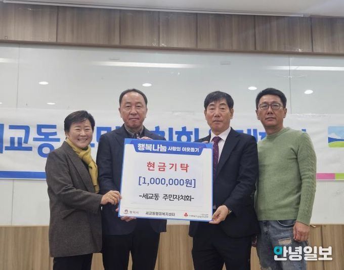 안녕일보 배윤 기자 | 평택시 세교동 주민자치회는 지난 4일, 세교동 행정복지센터에서 설 명절을 맞이하여 이웃돕기 성금 100만 원을 기부했다.