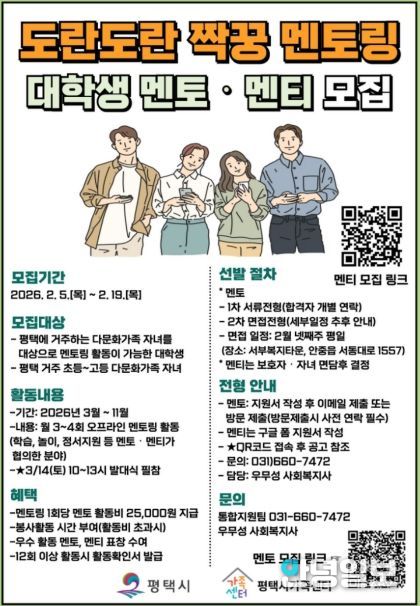 안녕일보 배윤 기자 | 평택시가족센터는 2월 5일부터 19일까지 다문화가족 자녀 대상 ‘도란도란 짝꿍 멘토링’에 참여할 대학생 멘토와 멘티를 모집한다.