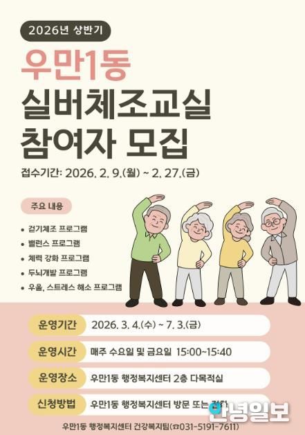 안녕일보 배윤 기자 | 수원시 팔달구 우만1동은 관내 어르신들의 건강 증진을 위해 2월 9일부터 2월 27일까지 ‘2026년 상반기 실버체조교실’ 참여자를 선착순으로 모집한다고 밝혔다.