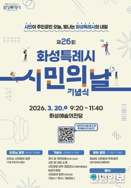 한편, ‘제26회 화성특례시민의 날’ 기념식은 3월 20일 오전 10시 화성예술의전당에서 열린다. 이번 기념식은 ‘시민이 주인공인 오늘, 빛나는 화성특례시의 내일’이라는 슬로건과 함께 시민이 무대를 꾸미는 참여형 행사로 진행된다.