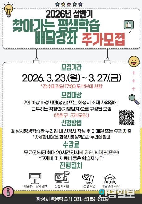 안녕일보 배윤 기자 | 화성특례시는 시민의 다양한 학습 수요를 반영한 맞춤형 평생학습 프로그램 운영을 위해 ‘2026년 상반기 찾아가는 평생학습 배달강좌’를 추가 모집한다고 밝혔다.