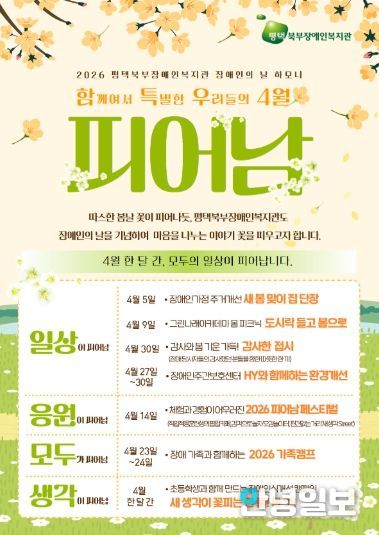 안녕일보 배윤 기자 | 평택북부장애인복지관에서는 제 46회 장애인의 날을 맞이하여, 4월 한 달 간2026 장애인의 날 행사 ‘함께여서 특별한 우리들의 4월, '피어남'’을 진행할 예정이다.