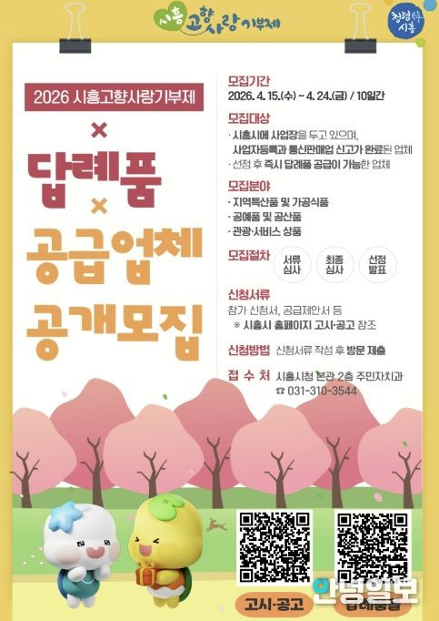 안녕일보 배윤 기자 | 시흥시는 고향사랑기부제 활성화와 지역 특색을 반영한 답례품 발굴을 위해 ‘2026년 고향사랑기부제 답례품 및 공급업체’를 공개 모집하며 4월 15일부터 24일까지 10일간 신청ㆍ접수를 받는다.