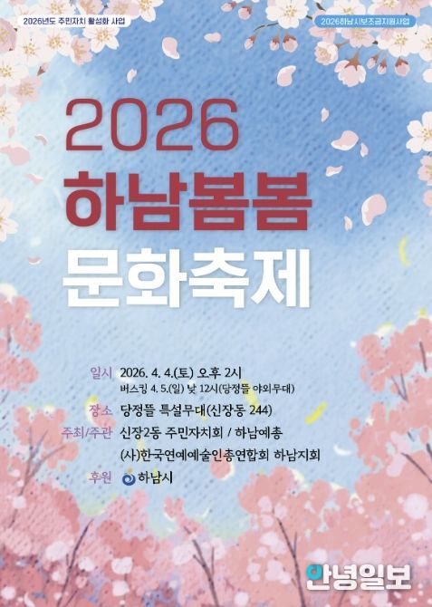 안녕일보 배윤 기자 | ‘2026 하남 봄봄 문화축제’가 오는 4월 4일 당정뜰 일원에서 열린다. 이번 축제는 신장2동 주민자치회와 (사)한국연예예술인총연합회 하남지회가 공동 주최·주관하고 하남시가 후원한다.
