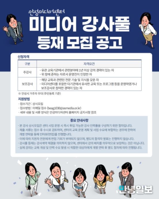 안녕일보 배윤 기자 | 안성시는 4월 1일부터 보다 체계적이고 전문적인 미디어 교육 운영을 위해 ‘미디어 강사풀’ 등재 강사를 상시 모집한다.