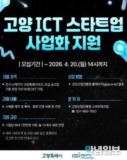 안녕일보 배윤 기자 | 고양산업진흥원이 ‘2026년 고양 ICT 스타트업 사업화 지원사업’ 참여 기업을 모집한다.