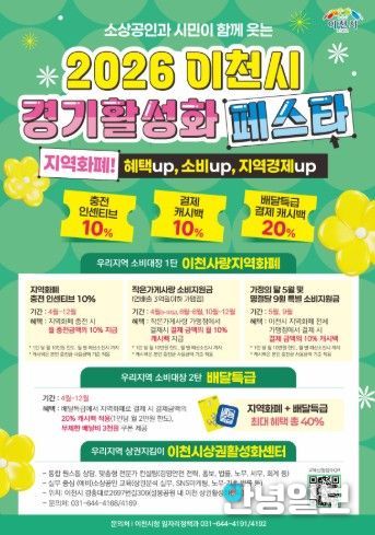 안녕일보 배윤 기자 | 이천시는 침체된 지역경제에 활력을 불어넣기 위해 2026년 4월 3일부터 ‘2026 이천시 경기 활성화 페스타’를 본격 추진한다고 밝혔다.