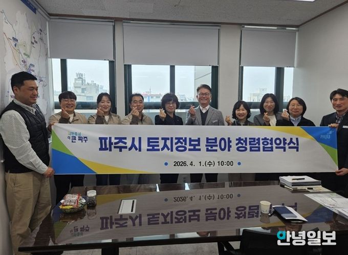 안녕일보 배윤 기자 | 파주시는 지난 1일 지적측량 수행기관인 한국국토정보공사 파주지사와 ‘토지정보 분야 청렴협의체’를 구성하는 내용으로 협약을 체결했다.