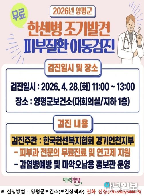 안녕일보 배윤 기자 | 양평군은 오는 28일 양평군보건소 지하 1층 대회의실에서 군민을 대상으로 ‘한센병 조기 발견을 위한 피부질환 이동검진’을 실시한다.