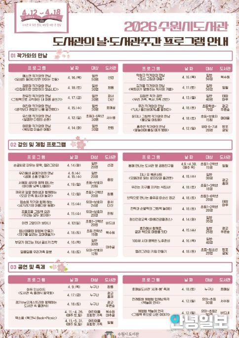 ‘아트 인사이드(창룡·광교홍재도서관, 4월 9~17일)’, ‘사계-봄 축제(호매실도서관, 4월 18일)’ 등 6개의 공연·축제가 열린다. ‘이진아 작가와의 만남(호매실도서관, 4월 15일)’, ‘예소연 작가와의 만남(선경도서관, 4월 16일)’ 등 12개의 저자 초청 강연도 열린다.