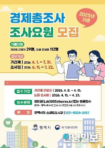 안녕일보 배윤 기자 | 평택시는 오는 8일부터 23일까지 ‘2025년 기준 경제총조사’ 현장 조사 업무를 담당할 조사요원을 모집한다.