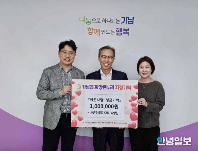 안녕일보 배윤 기자 | 여주시 가남읍 소재 (주)은산푸드는 지난 6일 가남읍 행정복지센터를 방문하여 관내 저소득 소외계층을 위한 이웃돕기 성금 100만 원을 전달했다.