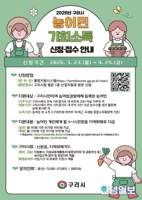 안녕일보 배윤 기자 | 구리시는 ‘2026년 농어민 기회 소득 지원사업’ 신청을 오는 4월 24일까지 접수한다고 밝혔다.