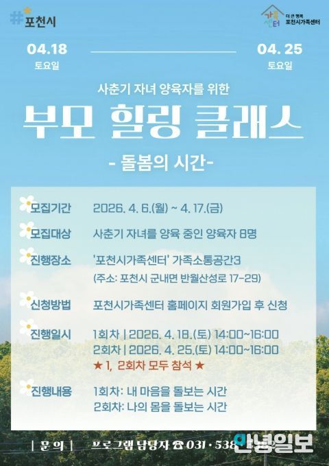 안녕일보 배윤 기자 | 포천시 더 큰 행복 포천시가족센터는 사춘기 자녀를 둔 양육자를 대상으로 ‘부모 힐링 클래스’ 참여자를 모집한다.