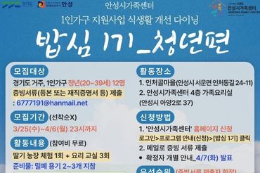 안성시 가족센터, 1인 가구 지원사업 식생활 개선 다이닝 '밥심 1기' 청년 참여자 모집