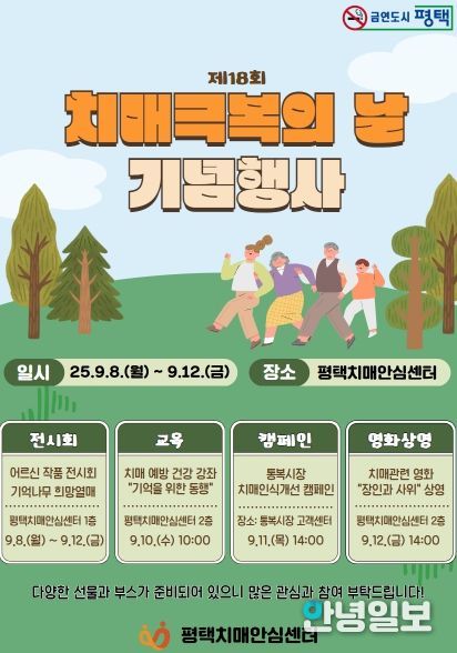 안녕일보 배윤 기자 | 평택시는 제18회 치매 극복의 날을 맞아 오는 8일부터 12일까지 치매 극복 주간행사를 개최한다고 밝혔다.