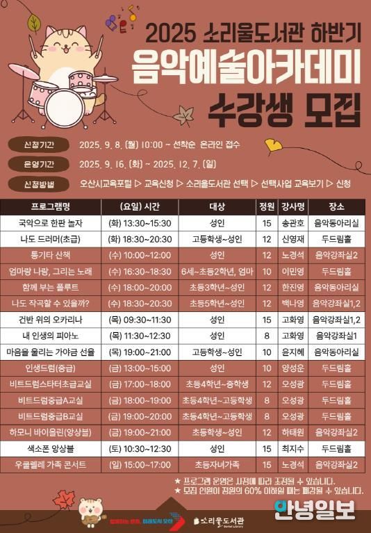 안녕일보 배윤 기자 | 경기도 오산시 소리울도서관은 시민들이 음악의 즐거움을 직접 체험할 수 있는 『2025 소리울도서관 하반기 음악예술아카데미』를 운영하며, 오는 9월 8일부터 수강생을 모집한다고 밝혔다.