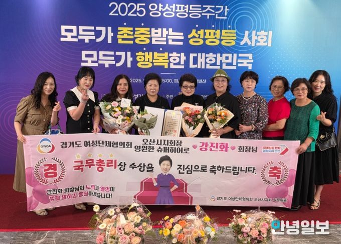 안녕일보 배윤 기자 | 오산시는 지난 9월 4일 서울 용산 피스앤파크 컨벤션에서 열린 '2025년 양성평등주간 기념식'에서 사)경기도여성단체협의회 오산시지회 강진화 회장이 양성평등진흥 유공으로 국무총리 표창을 수상했다고 밝혔다.