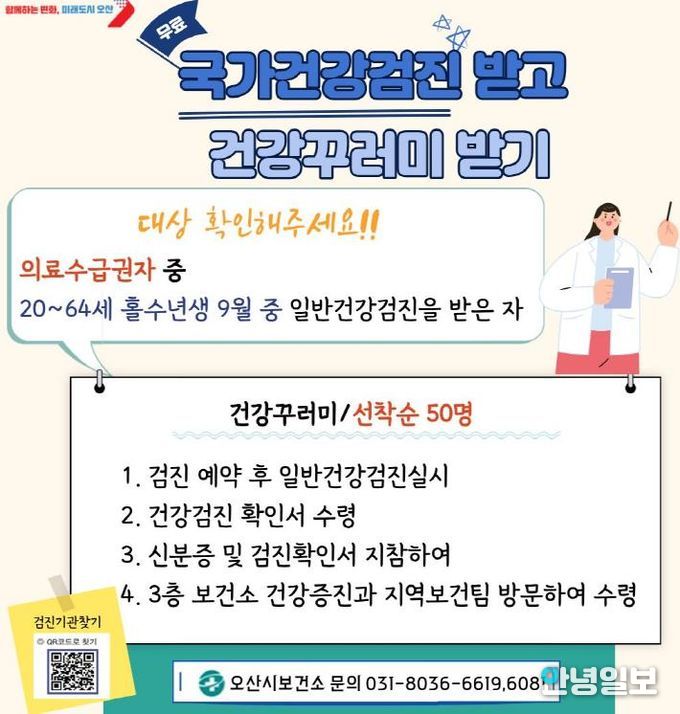 안녕일보 배윤 기자 | 오산시는 오산시보건소에서 의료급여수급권자의 건강권 보장을 위해 만 20세에서 64세 사이 홀수년도 출생자를 대상으로 하는 국가건강검진 참여를 적극 독려한다고 밝혔다. 또한 9월 중 검진을 완료한 선착순 50명에게는 ‘건강꾸러미’를 제공할 예정이다.