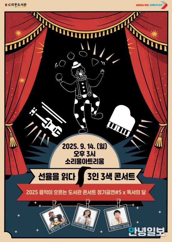 안녕일보 배윤 기자 | 오산시는 오는 9월 14일 오후 3시, 소리울도서관 소리울아트리움에서 『선율을 읽다; 3인 3색 콘서트』를 개최한다고 밝혔다. 이번 공연은 ‘2025 음악이 흐르는 도서관 콘서트 정기공연 #5’이자, 독서의 달을 맞아 시민들에게 특별한 문화예술 경험을 선사하기 위해 마련됐다.