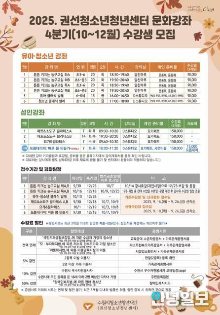 안녕일보 배윤 기자 | 수원시청소년청년재단 권선청소년청년센터는 오는 9월 16일부터 9월 26일까지 지역사회 평생학습 문화강좌 4분기(10~12월) 수강생을 모집한다.