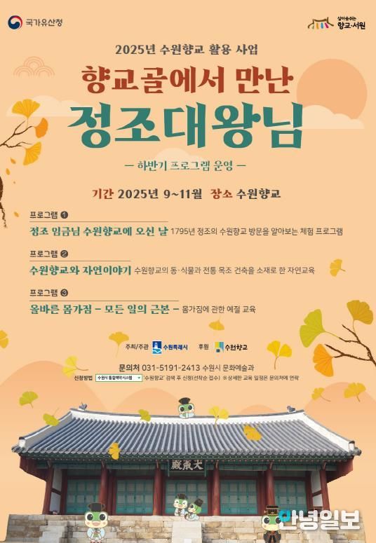 안녕일보 배윤 기자 | 수원시가 하반기 ‘향교골에서 만난 정조대왕님’ 프로그램을 9월 16일부터 11월 29일까지 수원향교에서 운영한다.