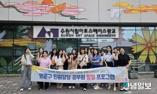 안녕일보 배윤 기자 | 수원시 영통구는 지난 16일, 수원시립아트스페이스광교에서 영통구 민원담당 공무원을 대상으로 -오늘은 힐링 DAY! 나를 위해 Cheer up!- 영통구 민원담당 공무원 마음치유를 위한 힐링 프로그램을 진행했다. 이번 프로그램은 반복적인 민원응대에 지친 공무원들이 일상에서 벗어나 몸과 마음의 여유를 되찾을 수 있도록 기획됐다.