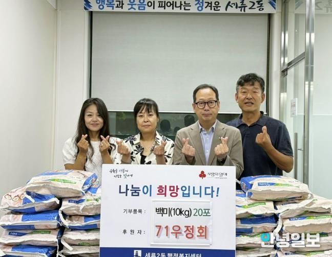 안녕일보 배윤 기자 | 71우정회는 지난 17일, 추석명절을 맞이하여 백미 10kg 20포를 세류2동 행정복지센터에 기부했다.