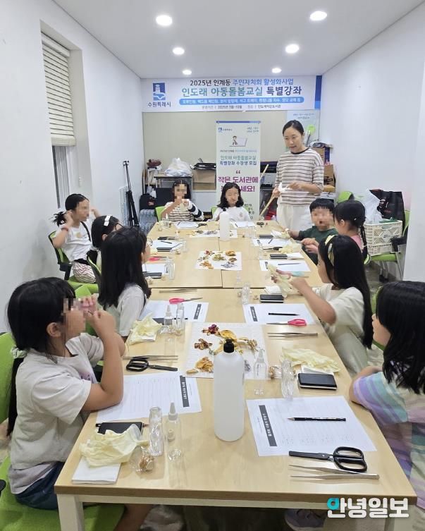 안녕일보 배윤 기자 | 수원시 팔달구 인계동 주민자치회는 9월 16일 인도래작은도서관에서 '인도래 아동돌봄 교실' 제8강 드라이플라워 디퓨저 만들기 수업을 진행했다.
