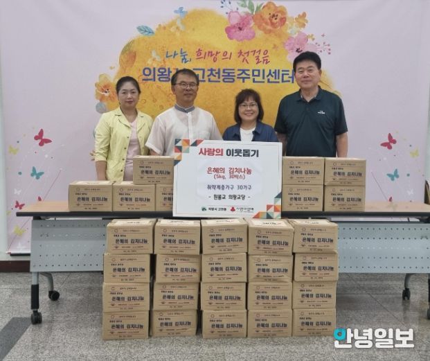 안녕일보 배윤 기자 | 의왕시는 고천동 소재 원불교 의왕교당이 지난 17일 취약계층에게 전달해 달라며 고천동주민센터에 김치(5kg) 30상자를 기탁했다고 밝혔다.