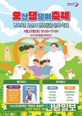 안녕일보 배윤 기자 | 오산시는 오는 27일 오산 반려동물테마파크(오산천로 72)에서 ‘2025 오산 댕댕이 축제’를 개최한다. 시는 이번 축제를 통해 반려동물 복지와 교감 문화를 확산하고, 오산을 반려친화도시로 자리매김하겠다는 구상이다.