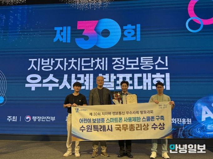 안녕일보 배윤 기자 | 수원시가 행정안전부 주관 ‘제30회 지자체 정보통신 우수사례 발표대회’에서 ‘어린이 보행 중 스마트폰 사용 제한 스쿨존 구축’으로 국무총리상(우수상)을 받았다. 발표대회는 18~19일 울산광역시 타니베이 호텔에서 열렸다.
