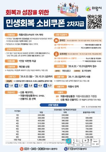 안녕일보 배윤 기자 | 의왕시는 시민들의 생활 안정을 돕기 위해 ‘민생회복 소비쿠폰 2차 지급’을 9월 22일부터 10월 31일까지 추진한다.