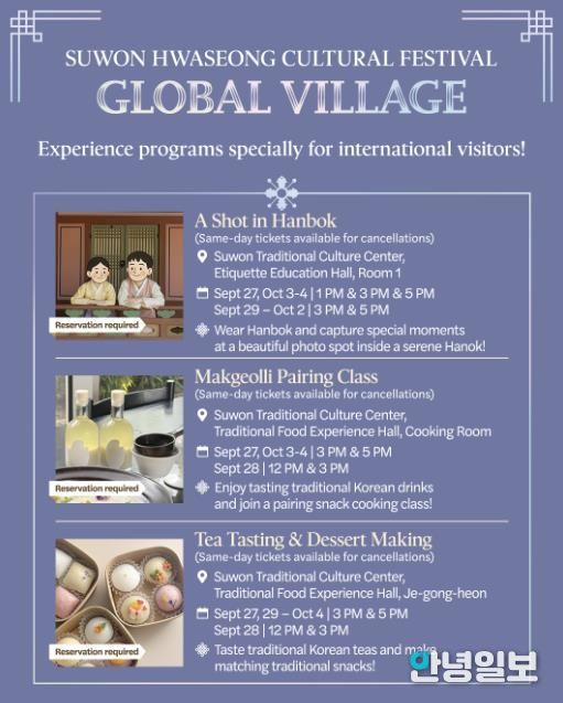 ‘글로벌 빌리지’는 세계 각국에서 온 방문객들이 한국 전통문화를 쉽고 깊이 있게 체험할 수 있도록 마련된 공간으로, ▲한복 체험‘한복한컷’ ▲행궁티룸 ‘다랑다랑’▲우리술 클래스‘주랑주랑’ ▲한옥놀이터 마당플 등 다채로운 프로그램이 운영된다.